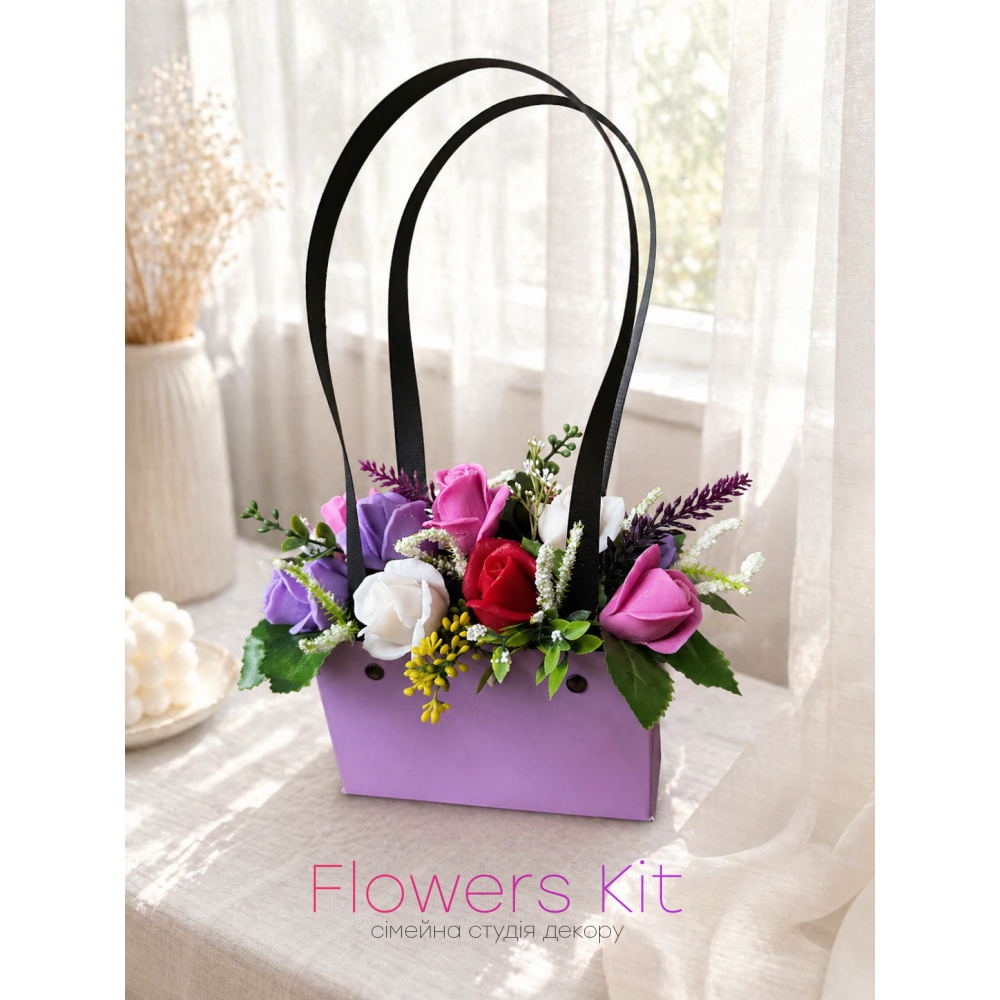 Букет выполнен в изящной коробке-сумочке с ручками, что придаёт ему особый шарм и делает подарок ещё более оригинальным. Сочетание нежно-розовых, лавандовых, белых и яркого акцентного красного цвета создаёт гармоничную композицию, которая выглядит живо и привлекательно. Цветы аккуратно собраны, имеют реалистичную форму и выглядят почти как настоящие.