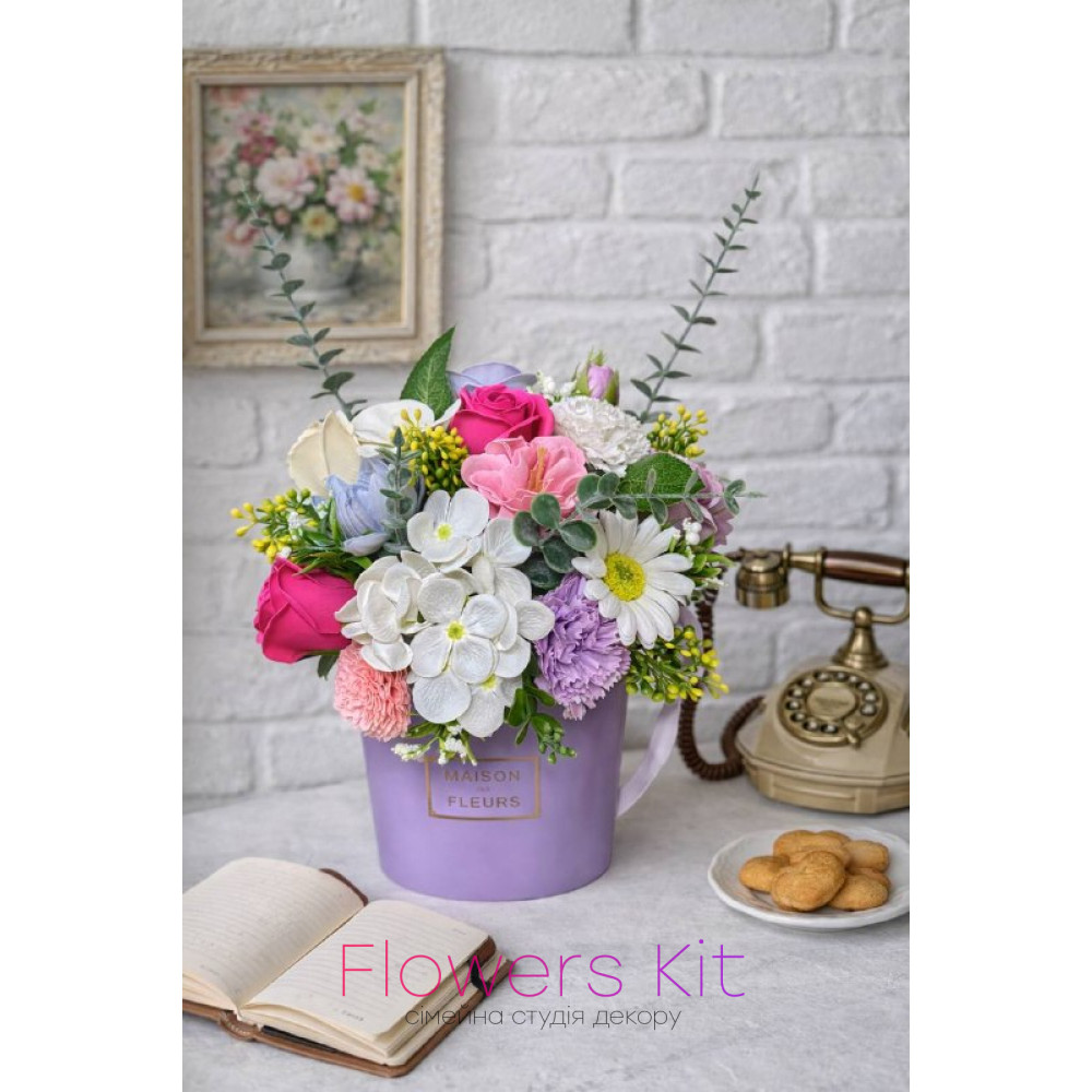 Лавандовая коробка выступает не просто как основа, а как часть стиля. Она задаёт тон — мягкий, благородный, немного винтажный. Цветы в ней не выглядят расположенными случайно — наоборот, создаётся ощущение, что каждый элемент продуман, как в хорошем интерьере.